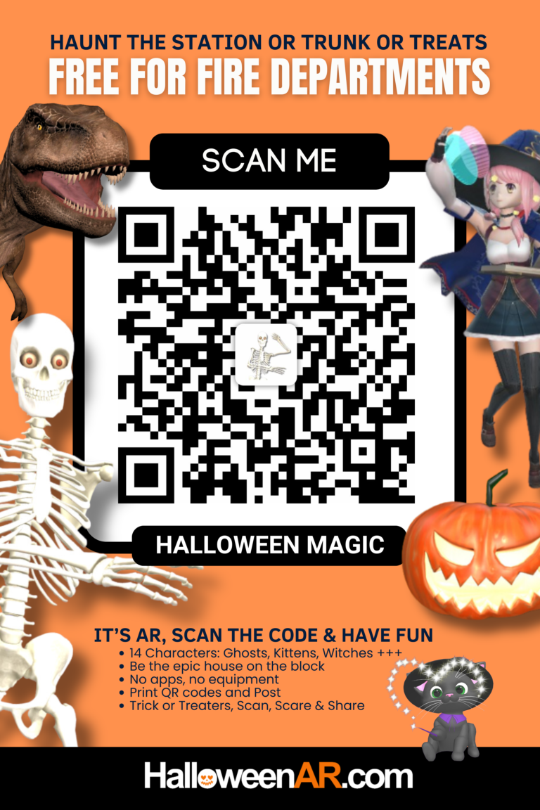 HalloweenAR.com is our free AR haunted experience, that we donate to fire departments. Transform your station or Trunk or Treat event into an interactive haunted house every October- no setup, no props, no equipment needed. Just print QR codes and watch families line up for spooky AR fun while you build community connections. It's engagement that's memorable, shareable, and completely free to fire departments. Visit HalloweenAR.com/FireStation for complete details.